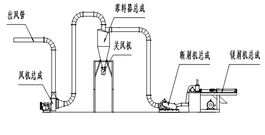 YMX-300A型液壓鎂屑機(jī)(全自動液壓鎂屑機(jī)、鎂屑斷屑機(jī)、碎屑機(jī)、鎂粉造粒機(jī)、鎂粉磨機(jī))由鎂屑機(jī)、斷屑機(jī)、風(fēng)機(jī)、液壓站、落料器、配電柜六部分組成(如下圖)。